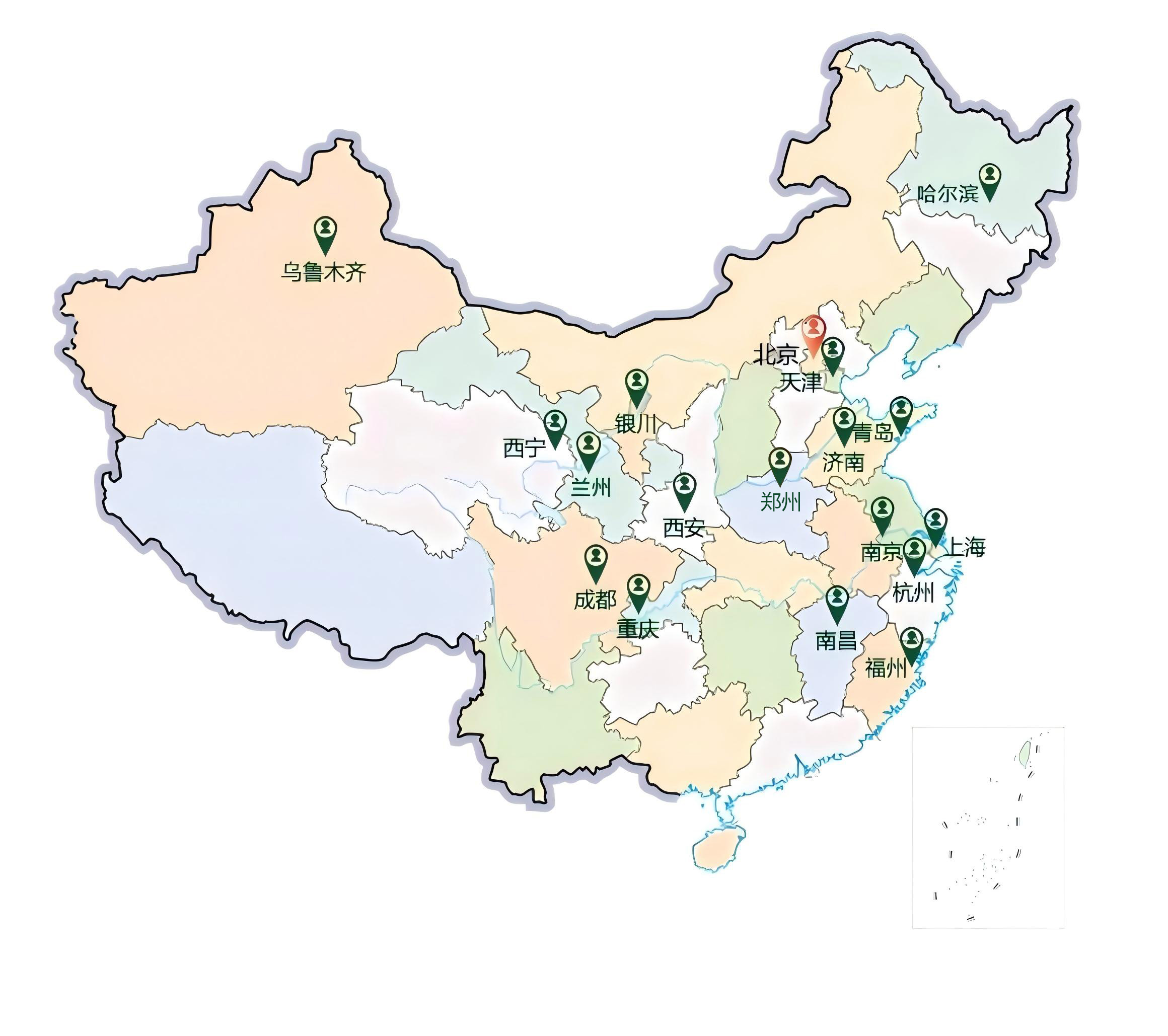 大地(集团)事务所目前在北京、青岛、济南、天津、上海、南京、哈尔滨、兰州、银川、西宁、西安、郑州、成都、重庆、杭州、南昌、福州、乌鲁木齐建立办公室,近距离服务客户,高效地为客户提供统一、标准、便捷的专业服务。